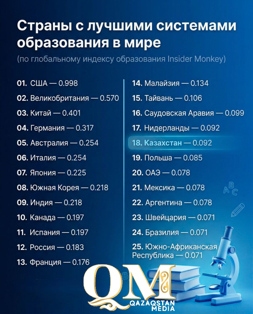 Казахстан занял 18-е место в рейтинге Insider Global Education Index, набрав 0,092 балла и войдя в группу стран с устойчиво развивающимися и международно интегрированными образовательными системами.
