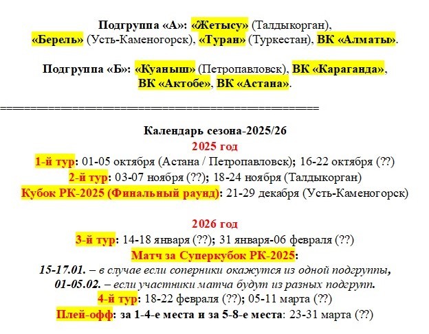 «Во второй раз в истории женской национальной лиги для восьми команд применяется формула с четырьмя малыми (в двух группах) и четырьмя большими (общими) турами. В плей-офф квартет сильнейших по итогам регулярного сезона разыграет медали, а клубы, занявшие 5–8-е места, определят одного кандидата на выбывание в высшую лигу», — пояснили в Казахстанской федерации волейбола.