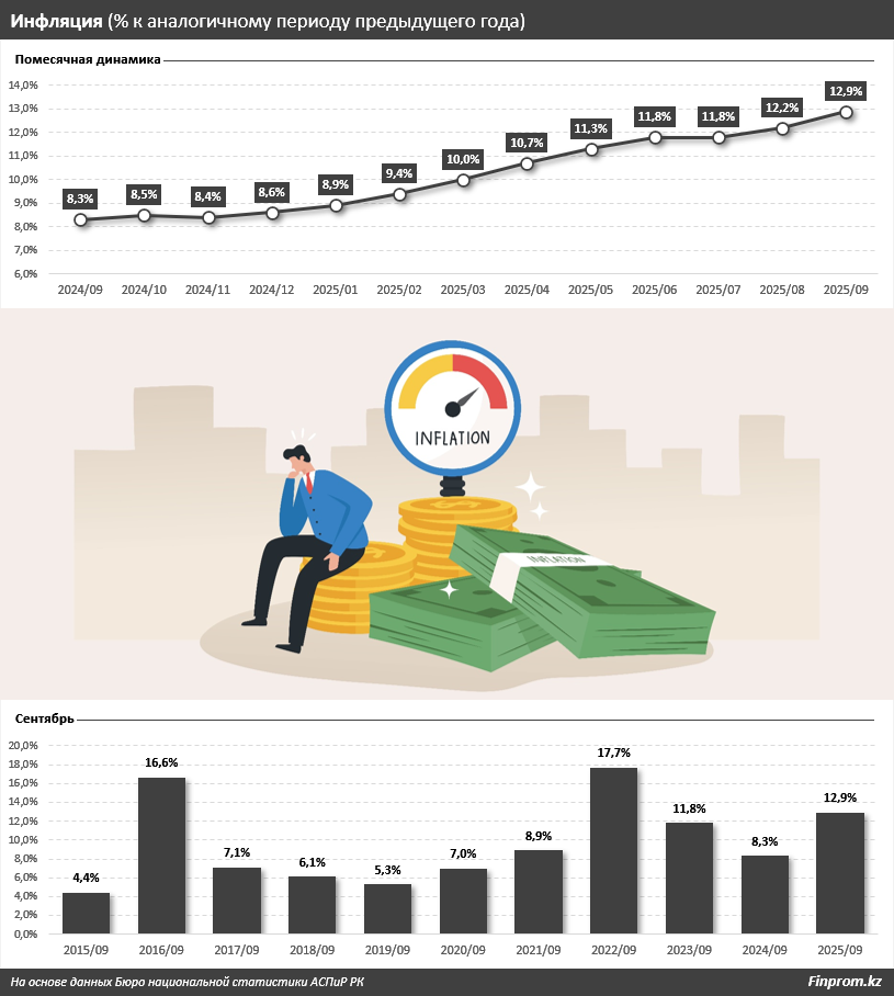 В Казахстане вновь ускоряется инфляция. По данным Бюро национальной статистики, в сентябре 2025 года ее уровень достиг 12,9 %, что стало максимальным значением за последние 25 месяцев. Основным источником инфляционного давления остаются коммунальные услуги и продукты питания, сообщает Qazaqstan Media.